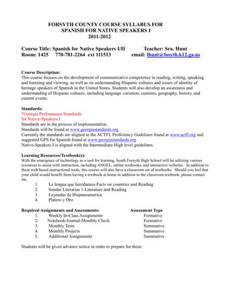 Free PDF FORSYTH COUNTY COURSE SYLLABUS FOR SPANISH FOR NATIVE ... Doc Internet Archive
